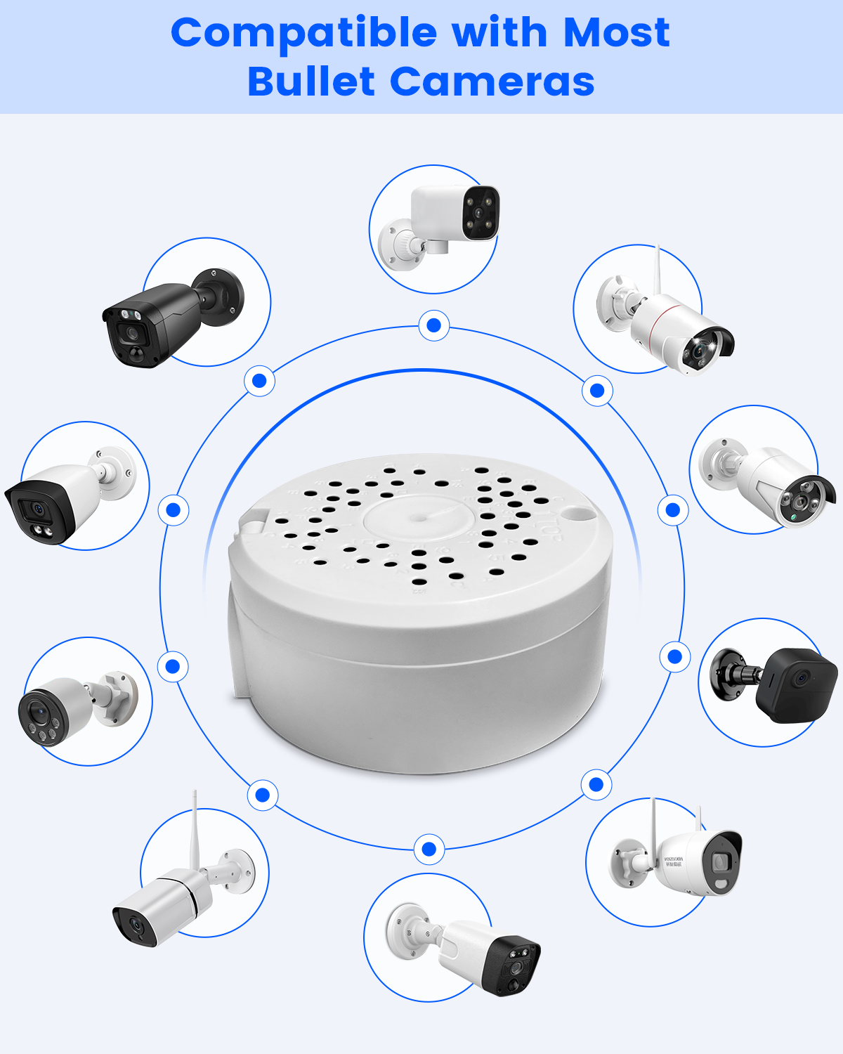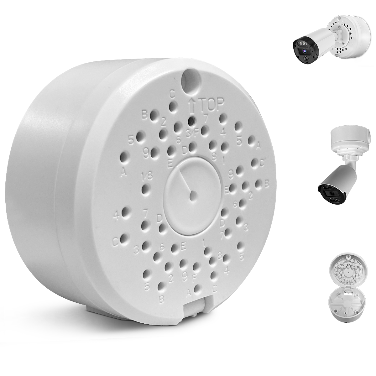 About This Item Installation Video Unboxing Video Product Information Quick Setup with Universal Fit : Designed for easy installation, this round camera junction box fits most standard bullet-style security cameras. With its user-friendly design and reliable mounting system, setting up your surveillance equipment is faster and cleaner—perfect for both pros...